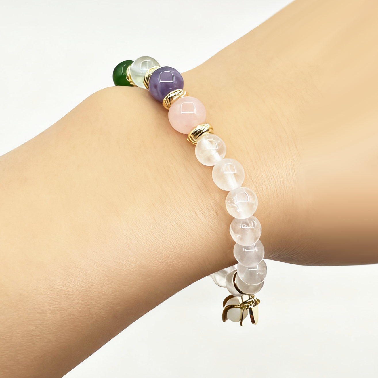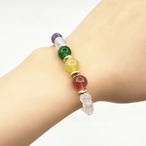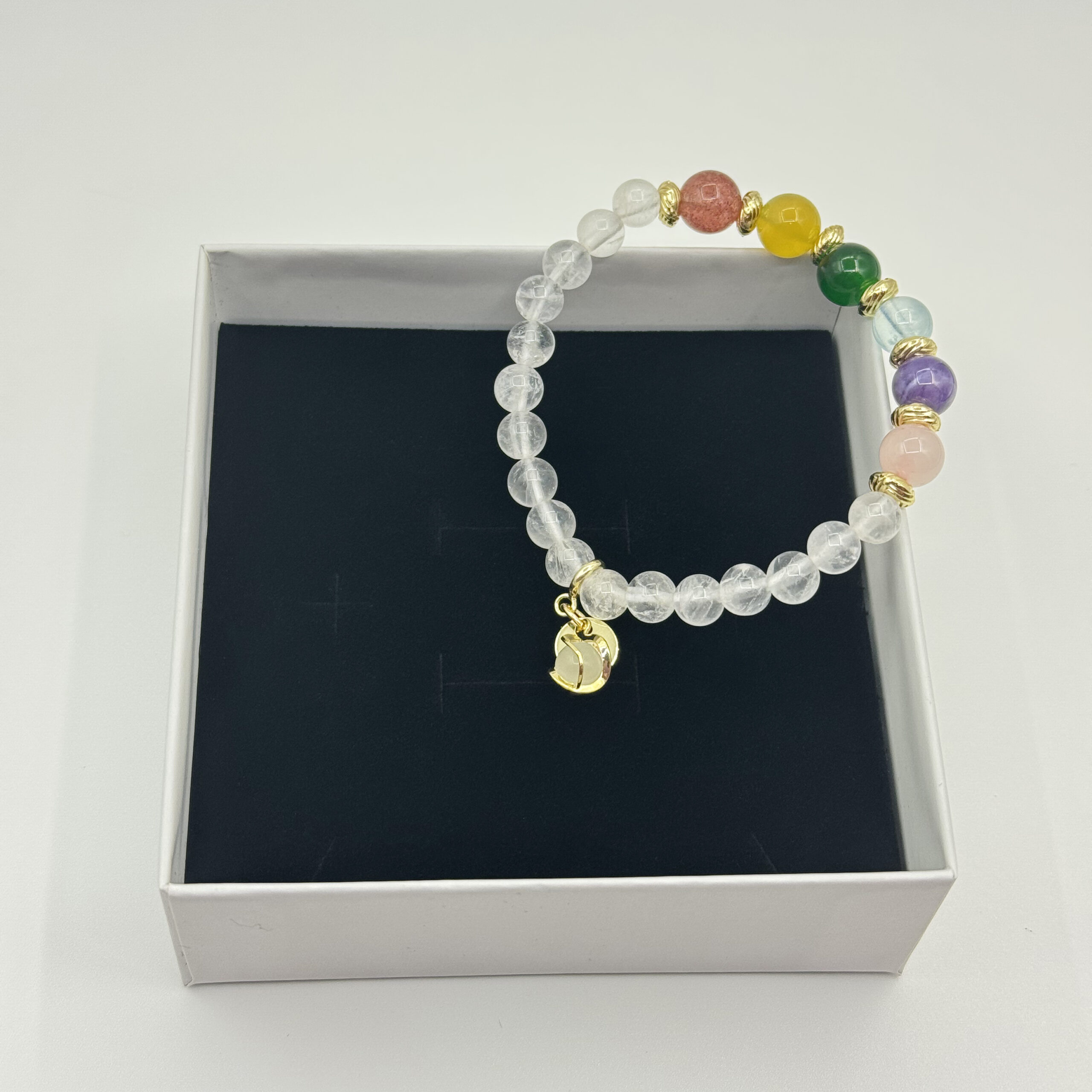Colorful & Clear Quartz Lunar Bracelet is an accessory full of energy and dreaminess. It takes clear quartz as the main bead and is paired with chakra gemstones such as strawberry quartz, citrine, green chalcedony, blue crystal, amethyst, and rose quartz. The purity of clear quartz and the brilliance of rainbow gemstones interweave to create a layered and mysterious charm. Clear quartz is clear and pure, symbolizing purification and balance; strawberry quartz is pink with “seeds”, implying love and luck; citrine is bright yellow, representing wealth and vitality; green chalcedony is fresh green, symbolizing vitality and protection; blue crystal is as clear as the sea, implying wisdom and communication; amethyst is deep and dreamy, representing spirituality and intuition; rose quartz is soft and pink, symbolizing love and tenderness.