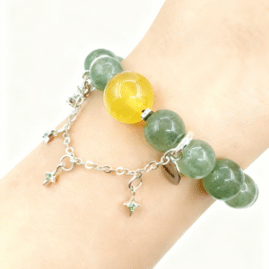 Emerald Crystal & Yellow Agate Bracelet is an accessory full of natural vitality. It takes emerald crystal as the main bead and is paired with a bright yellow agate bead. The color collision is fresh and eye-catching. The emerald crystal has a fresh emerald green color with a natural crystal texture, symbolizing vitality and hope; the yellow agate bead is bright yellow, implying warmth and vitality.