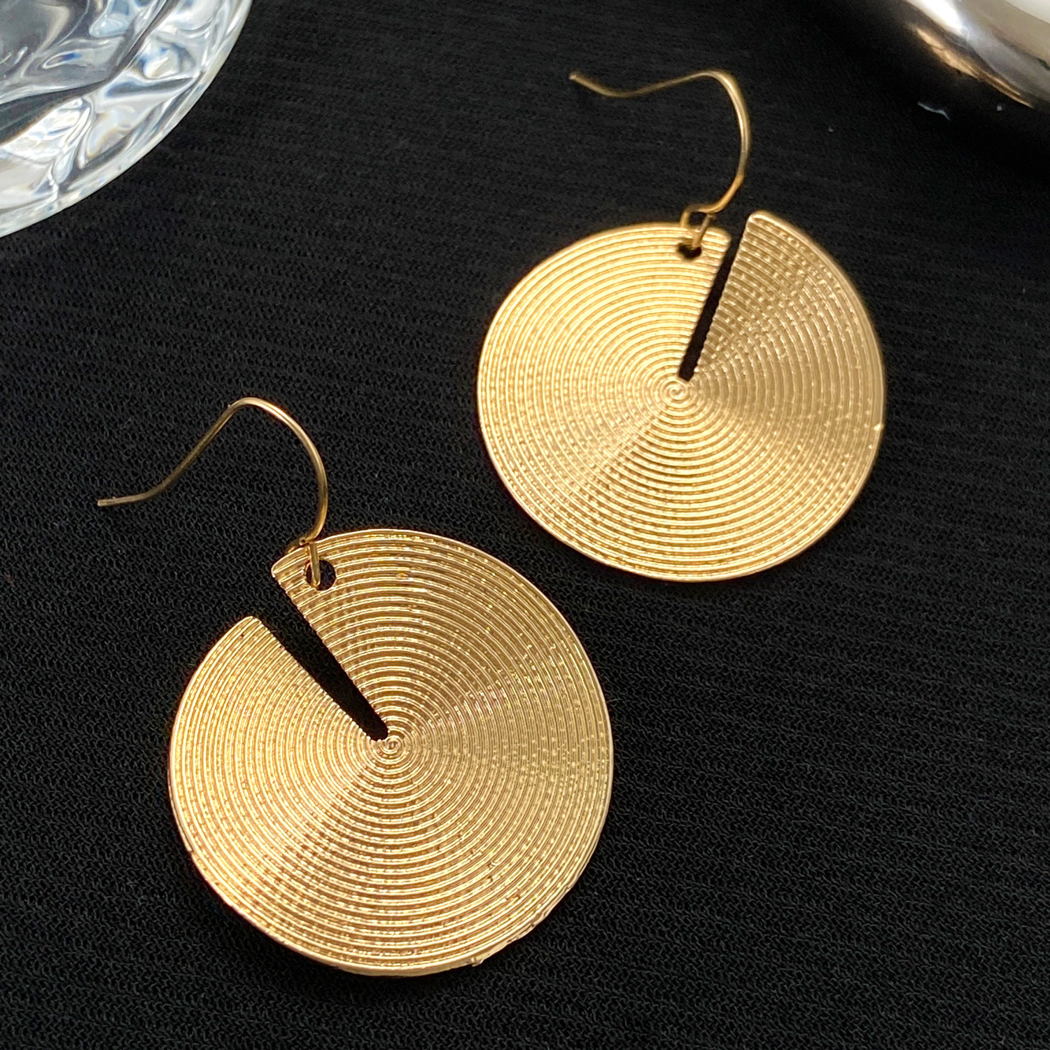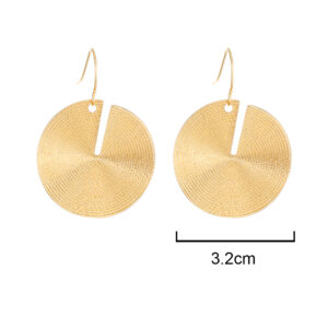 These earrings feature a circular shape with exquisite concentric textures. The unique cut – out notch breaks the convention, adding a touch of fashion and individuality. Through the gold – plating process, they showcase an even and brilliant golden sheen, exuding a luxurious texture. With a simple yet elegant style, they have a strong European and American fashion flair. Whether paired with casual wear to show a laid – back vibe or with formal attire to highlight elegance, they can easily become the highlight of your look. They are ideal accessories for those who pursue fashion and individuality.