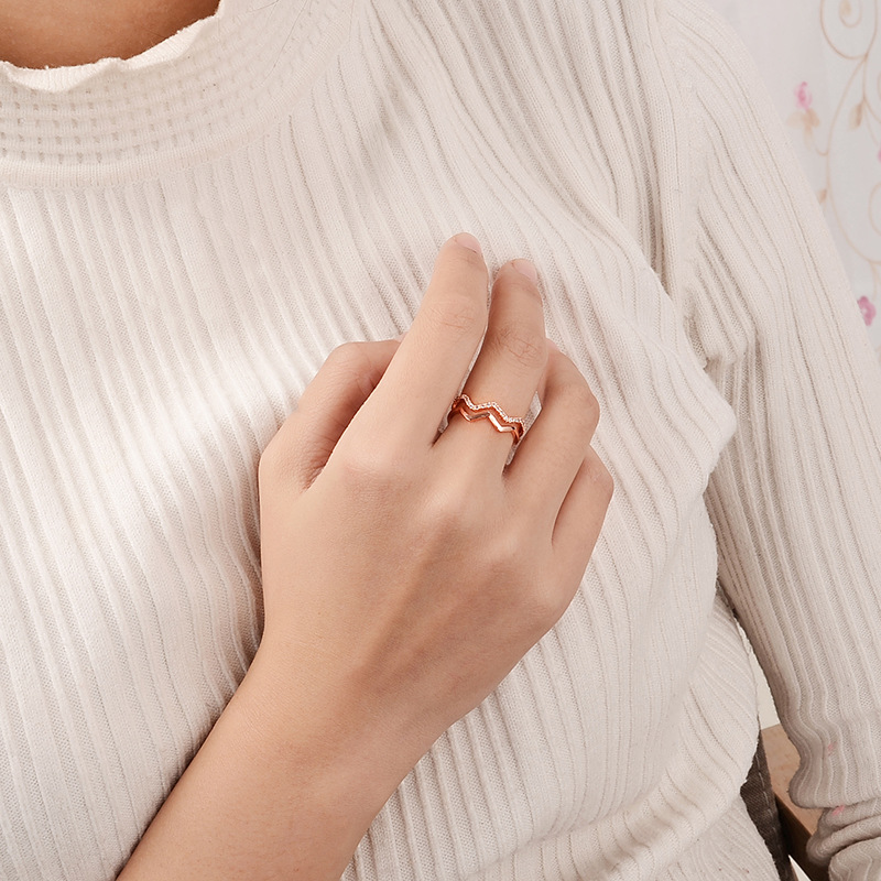 This ring features a trendy open – ended design, which makes it easy to wear and adjust for a perfect fit. Inspired by dynamic wave lines, its smooth and rhythmic shape showcases a unique sense of fashion. The ring is meticulously crafted from rose – gold – plated material, presenting a soft and romantic hue. On one side, it is adorned with delicate small diamonds that sparkle brilliantly under light, adding a touch of luxury and refinement. Whether for daily wear or paired with evening gowns, it can effortlessly enhance your elegance. It is a fashionable accessory that combines beauty and practicality.